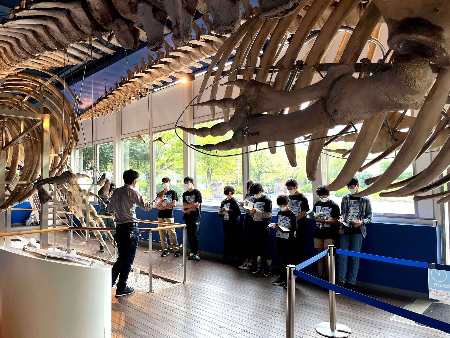 第7回授業は、第1回授業で授業をしていただいた東京海洋大学海洋環境科学部門 助教 中村玄さんを講師に実施され、まずは東京海洋大学内にあるマリンサイエンスミュージアム内を案内して頂きました。