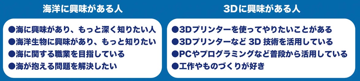 3Dの分野において、日本の第一線で活躍している吉本大輝が3D主任講師、東京海洋大学 鯨類学研究室の中村玄准教授が海洋主任講師となり、中学生が8ヶ月間の授業を通して一人ひとつの海洋生物について徹底的に研究し、3D技術を活用した研究発表を行う体験型の探究プロジェクトです。